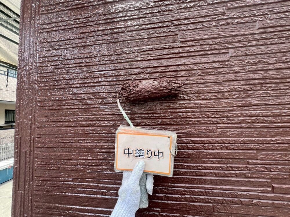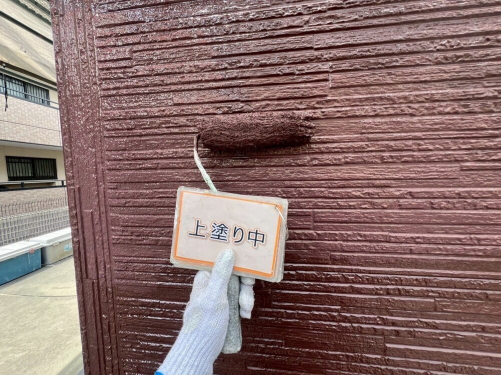 【上塗り】塗料を3回塗り重ねることで外壁の艶が増し、紫外線や雨水に強い耐久性のある外壁に仕上がります。
