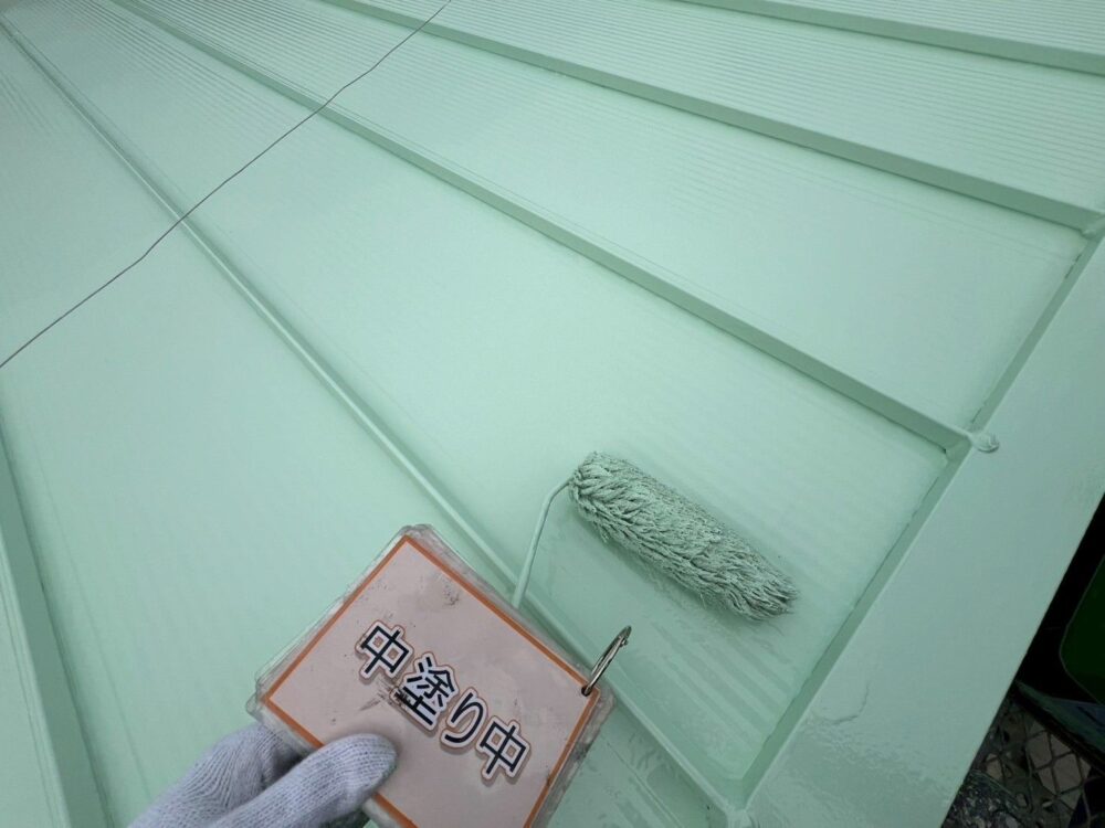 【上塗り】塗料を塗り重ねることで艶が増し、紫外線や雨水に強い耐久性のある屋根に仕上がります。