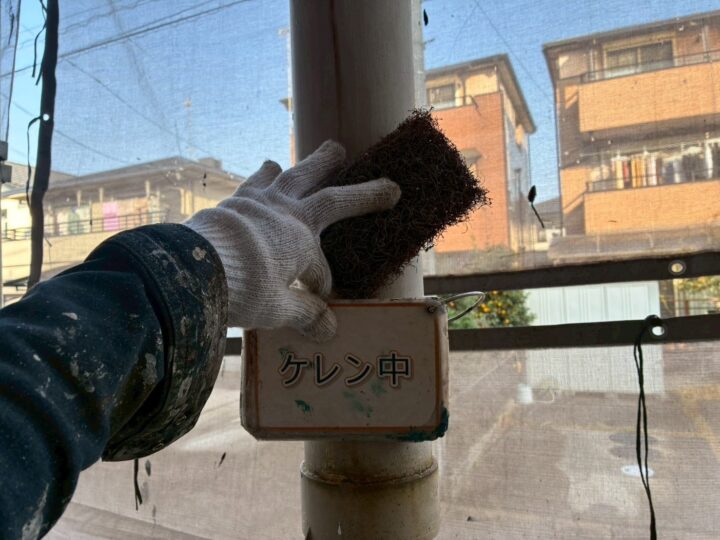 【ケレン】錆や汚れをきれいに落とし、平面を平滑に仕上げ塗料の密着率を上げる作業をします。