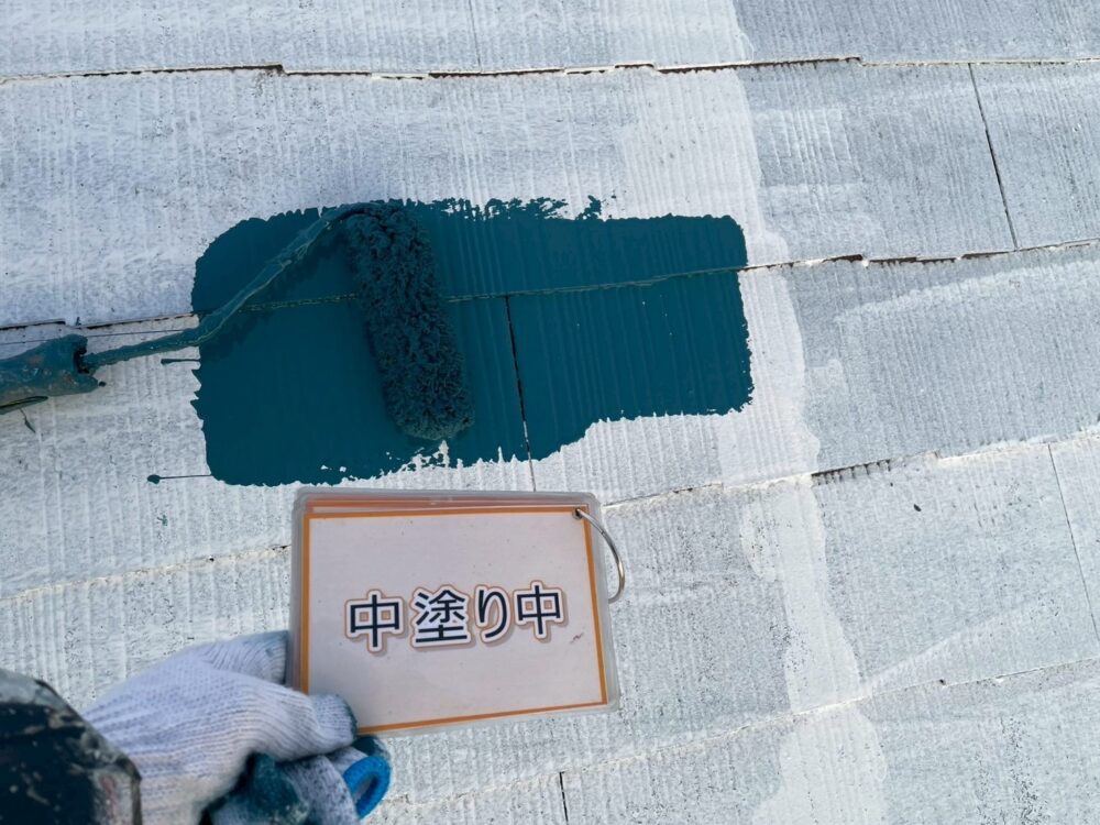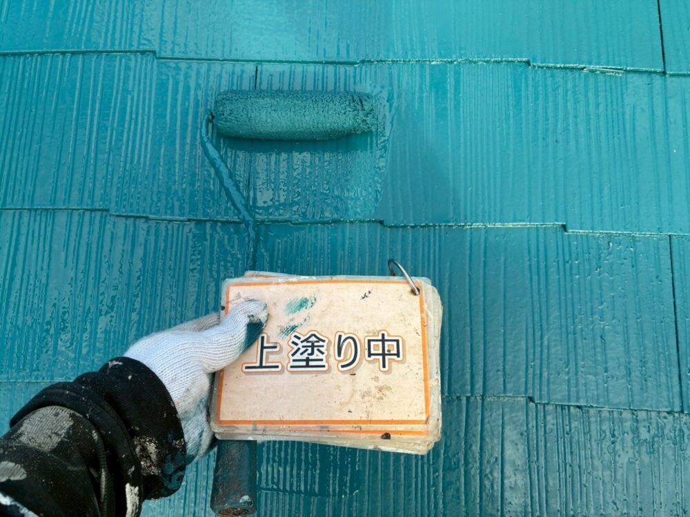 【上塗り】塗料を3回塗り重ねることで艶が増し、紫外線や雨水に強い耐久性のある屋根に仕上がります。
