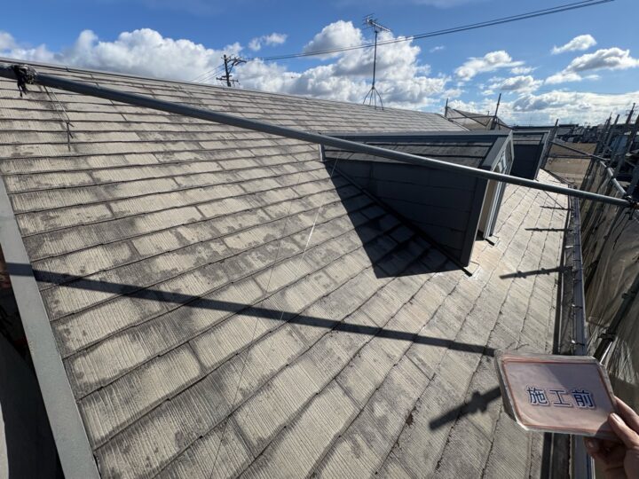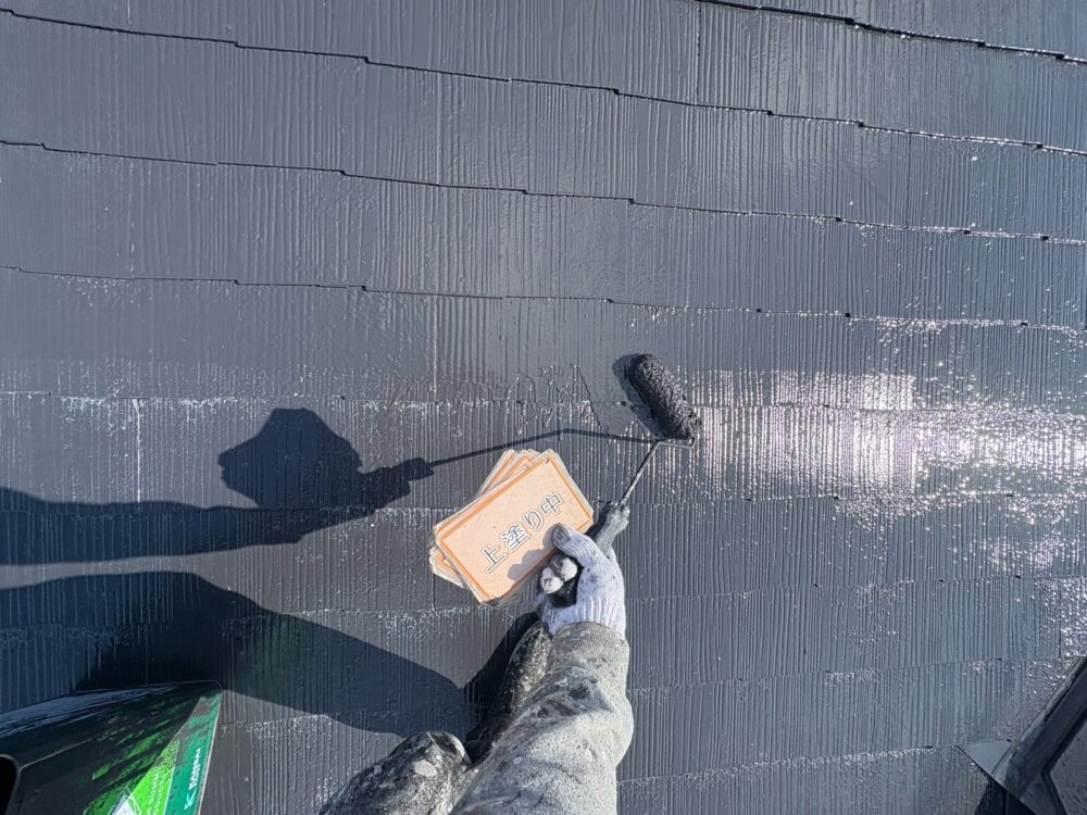 【上塗り】塗料を3回塗り重ねることで艶が増し、紫外線や雨水に強い耐久性のある屋根に仕上がります。