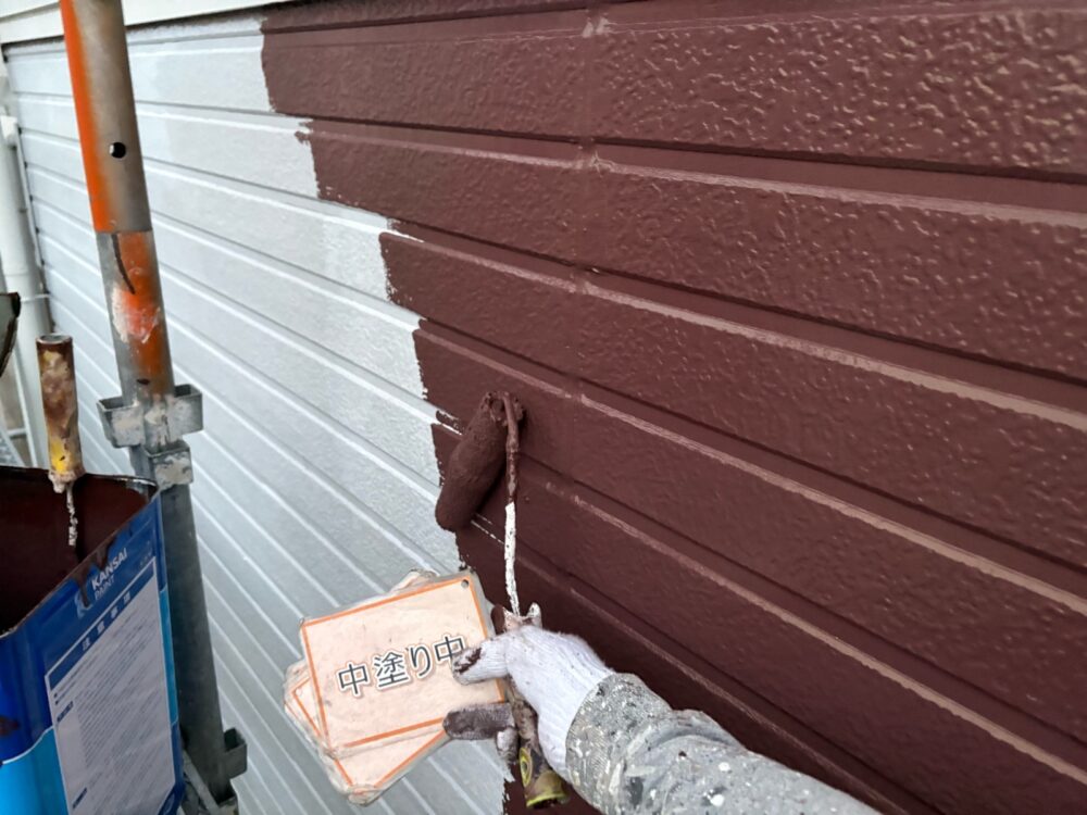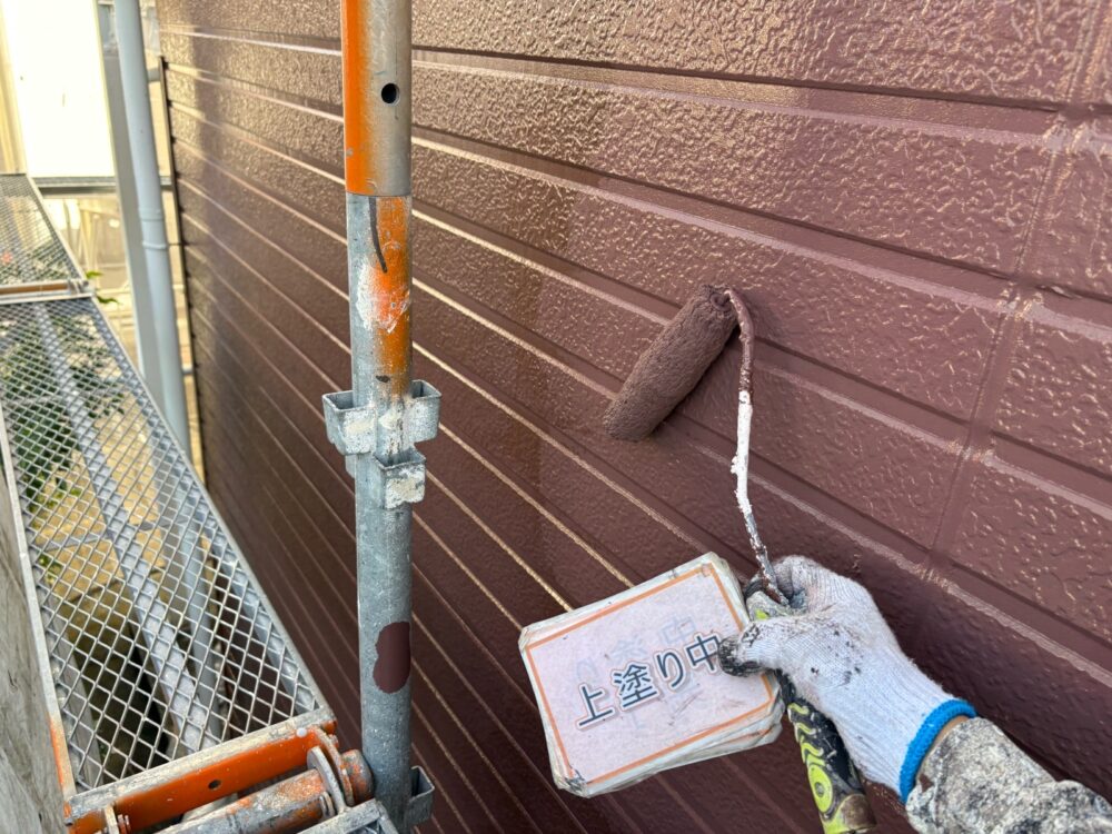 【上塗り】塗料を3回塗り重ねることで外壁の艶が増し、紫外線や雨水に強い耐久性のある外壁に仕上がります。